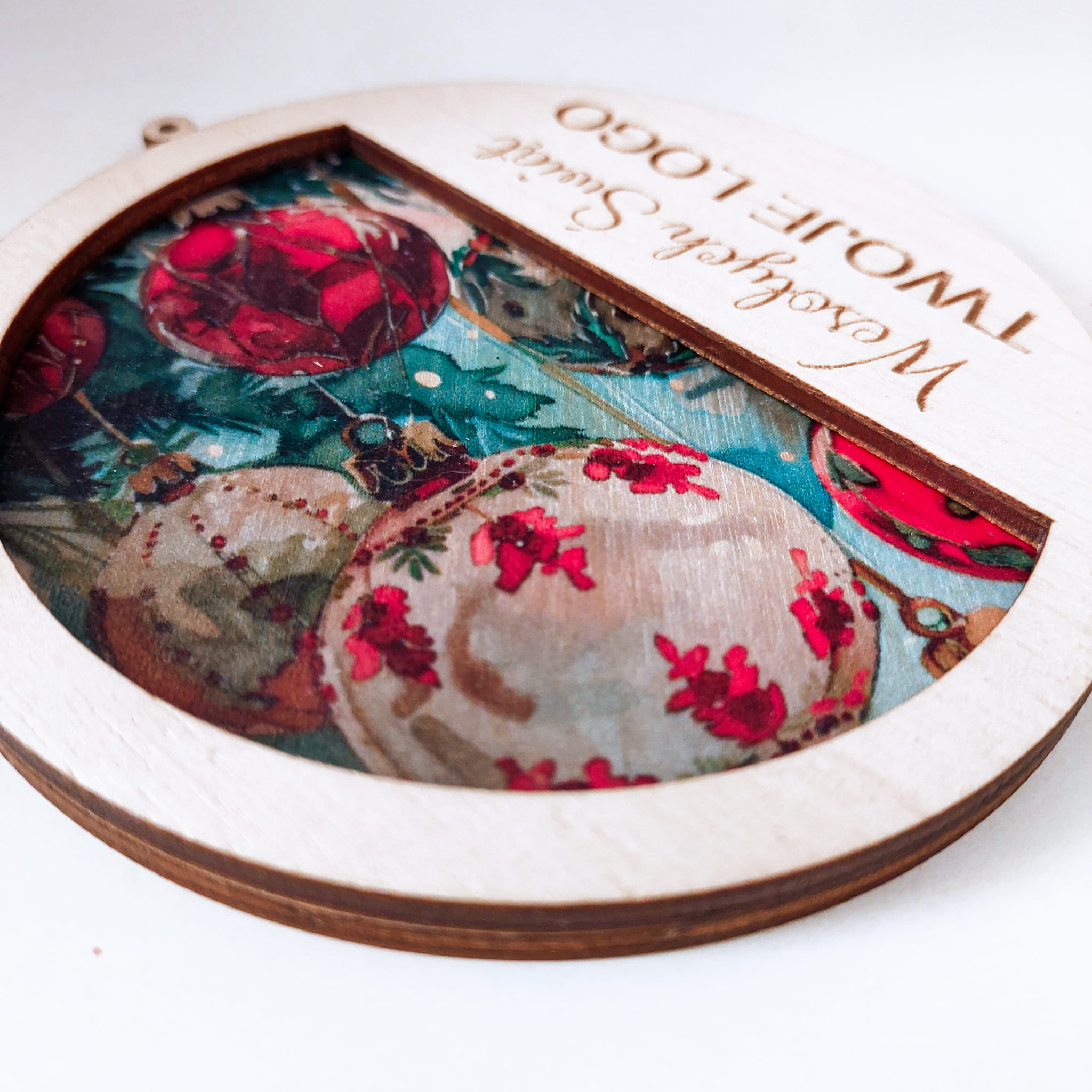 Dwuwarstwowa bombka choinkowa z drewnianej sklejki z możliwością personalizacji.